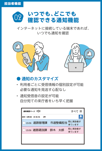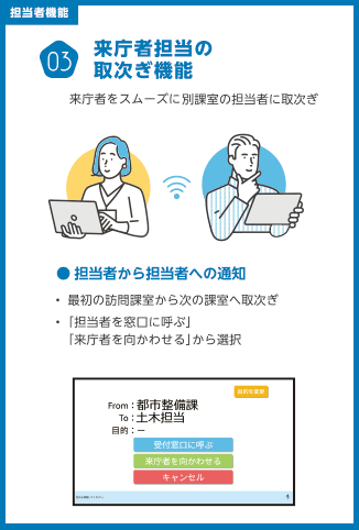 スタッフが窓口で行っていた来庁者の訪問先の確認を、来庁者自身が来庁先を選び受付が出来るようになることで、 スタッフはヒアリングや取次ぎ対応に追われず、本来の業務に集中できるようになります。 また、窓口混雑の解消にもつながり、組織全体の効率化を実現します。