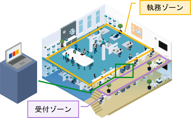 自治体向けに開発し、オフィス改革の取組みの一つである、窓口カウンターの集約「受付ゾーン」、執務スペースの一体化「執務ゾーン」に適しており、職員と来庁者とのつなぐを実現します。また、ゾーンニングによる人のアクセスを制御するセキュリティ強化に役立つことが出来ます。