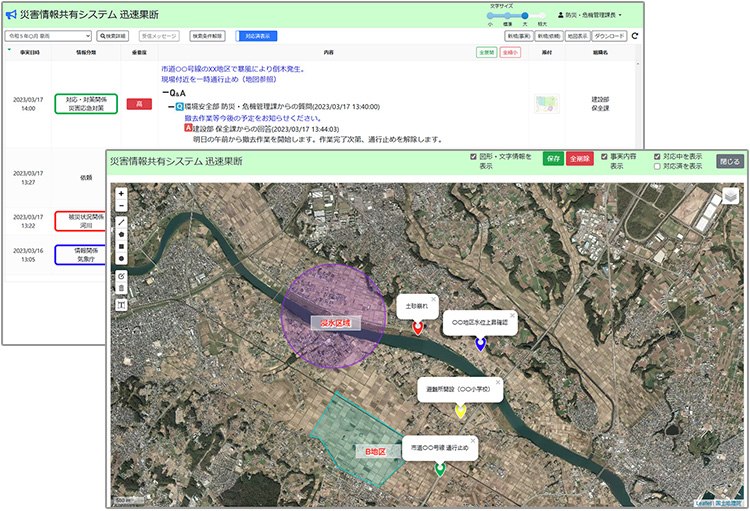 災害情報共有システム迅速果断は、災害時系列を記録するWEB版ホワイトボード。災害情報を対策本部・現場・避難所からリアルタイムに共有できる。また、災害情報に位置情報を紐づけて管理でき、災害現場の写真も全拠点で共有できるシステムである。