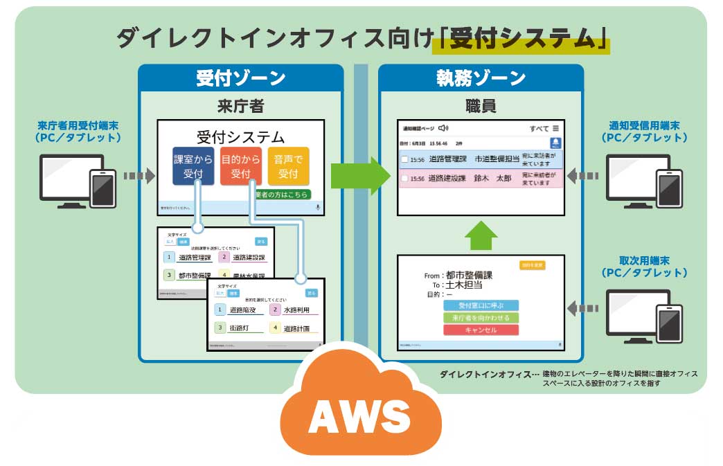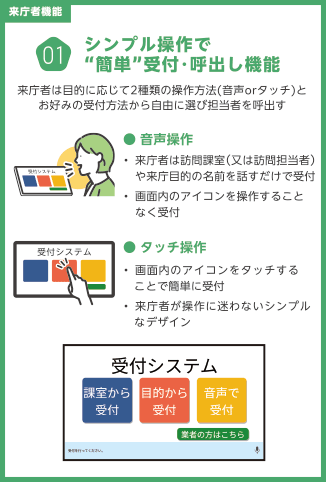 「Amazon Lexをコアとする当社独自の音声対話技術をベース」に、「音声・タッチ両対応の特性を活かし、あらゆる利用者のストレスフリーな受付を実現」したシステムです。