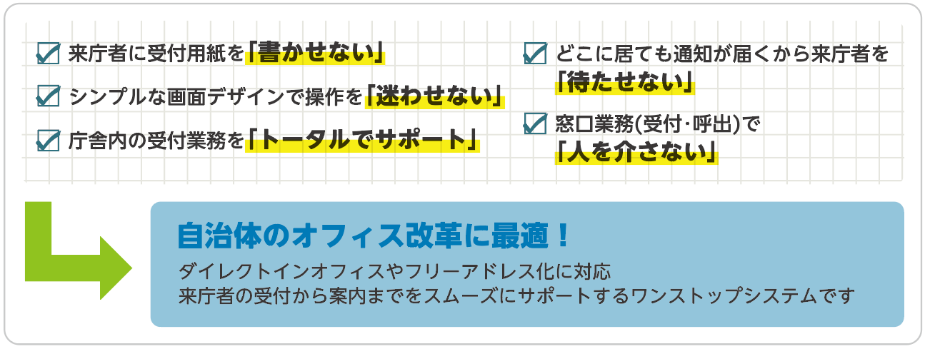 快適な受付サービズを実現するために、「書かない」、「迷わせない」をコンセプトとし、総務省が推進している自治体窓口業務のDX化の加速化に向けて、「エトレ:ETRe」は中心的な役割を果たす基幹的なサービスです。